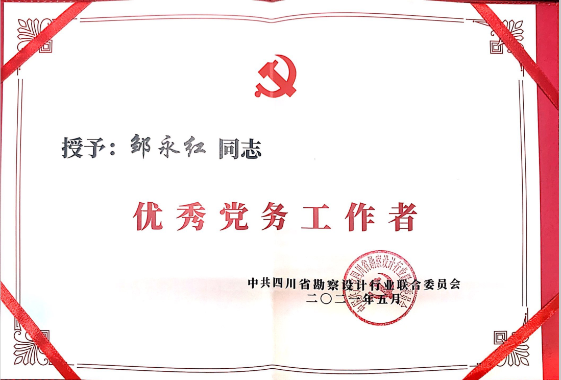 九游老哥J9俱乐部官网工程设计院党支部书记邹永红同志荣获中共四川省勘察设计行业联合委员会颁发的“优秀党务工作者”荣誉称号。