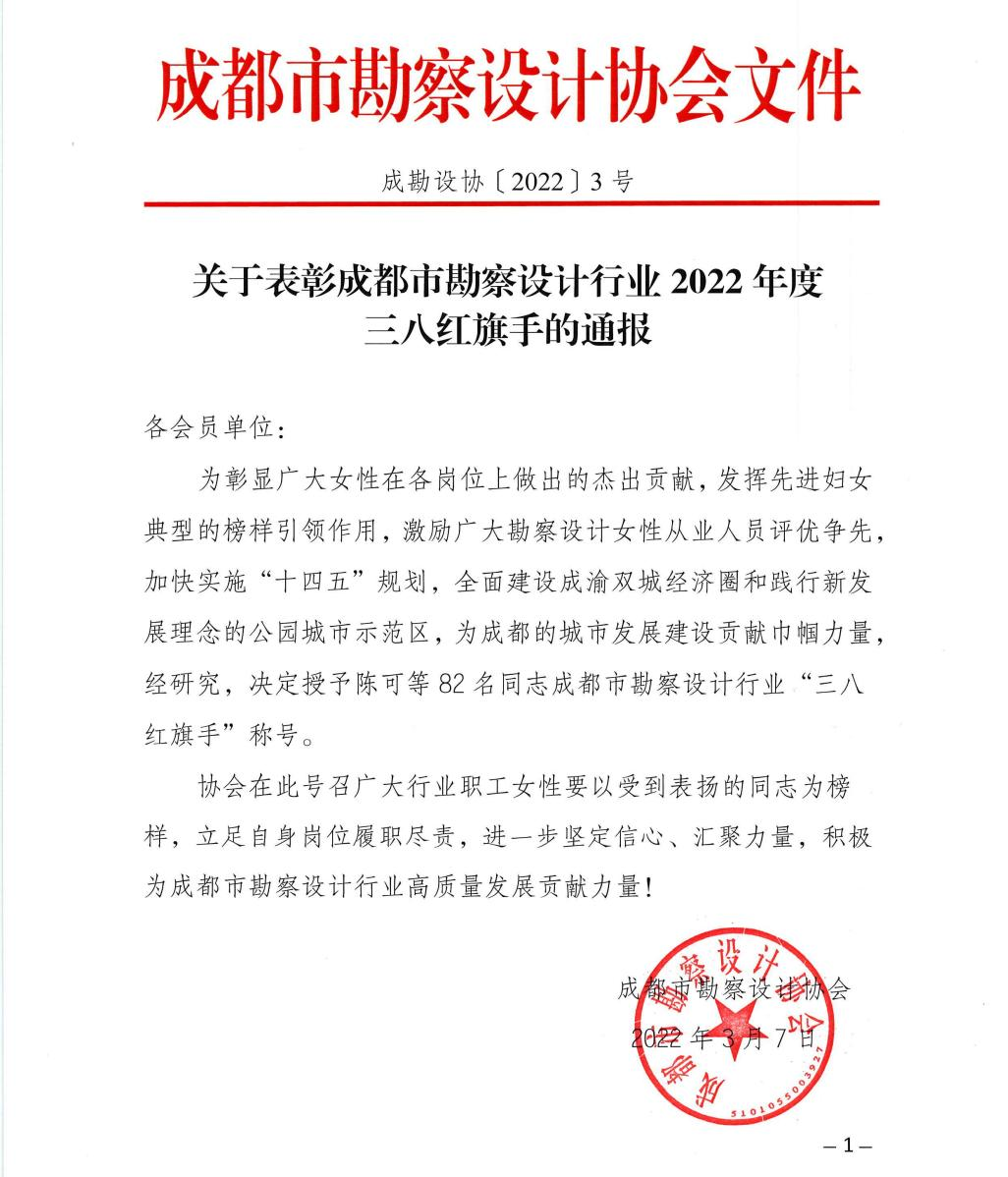 会议由企划发展部副部长牟淼主持。会上,张焓部长宣读了《关于表彰成都市勘察设计行业2022年度三八红旗手的通报》文件。此前,通过内部推荐七名优秀女职工参与本次市勘协的“三八红旗手”评选,集团总部的钟溪航、王秀娟,西部业务区胡晓、李桂娇,南部业务区李诗宇等五名职工通过最终评审,获得了该项殊荣。从市勘协发布的文件名单中获奖人数上看,可以说创造了行业之最,这代表了市勘协对我们工作的高度认可。