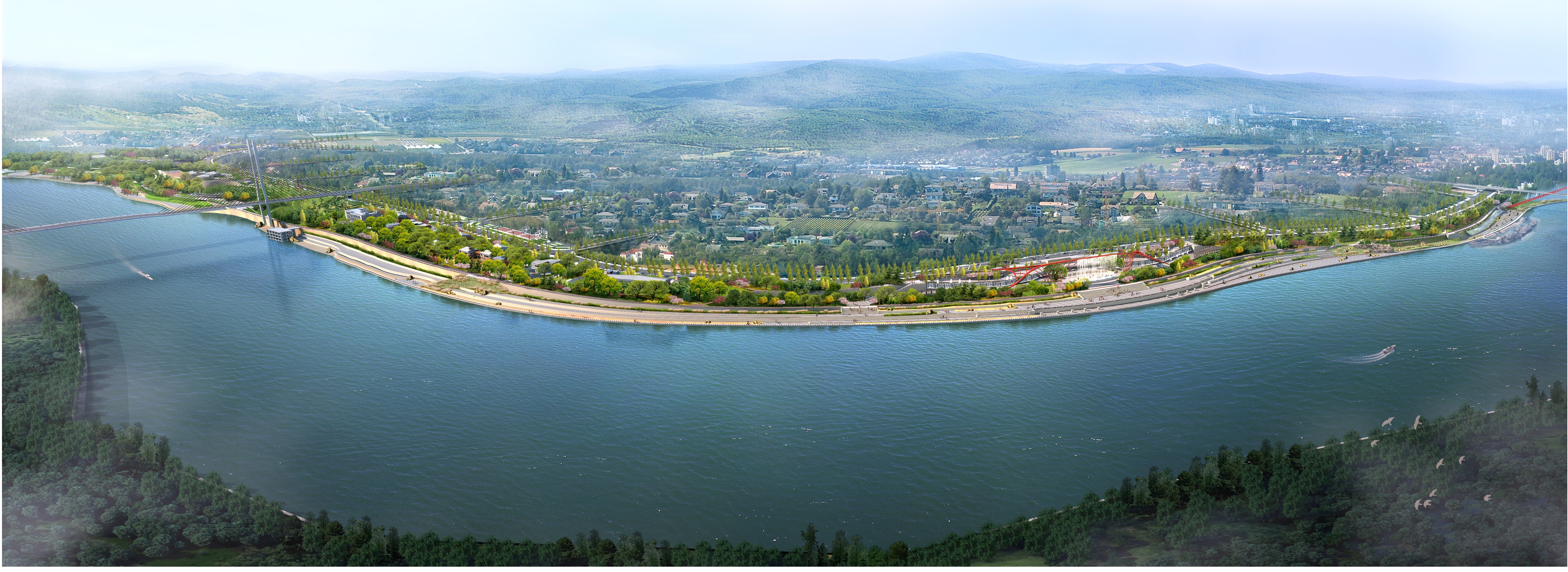 D区 活力滨江。区段造景因地制宜,让景观从前段的人文属性回归到自然属性,由此体现宜宾人对未来、自然、长江、下一代和生命的省思和态度。